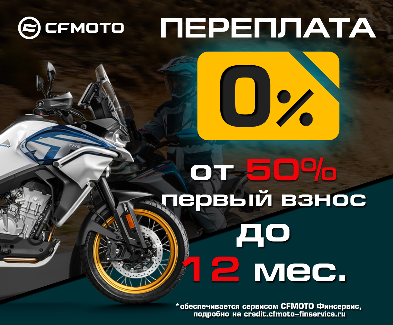 Теперь мотоциклы CFMOTO можно приобрести БЕЗ ПЕРЕПЛАТЫ на 12 месяцев с первоначальным взносом от 50% РРЦ на технику.